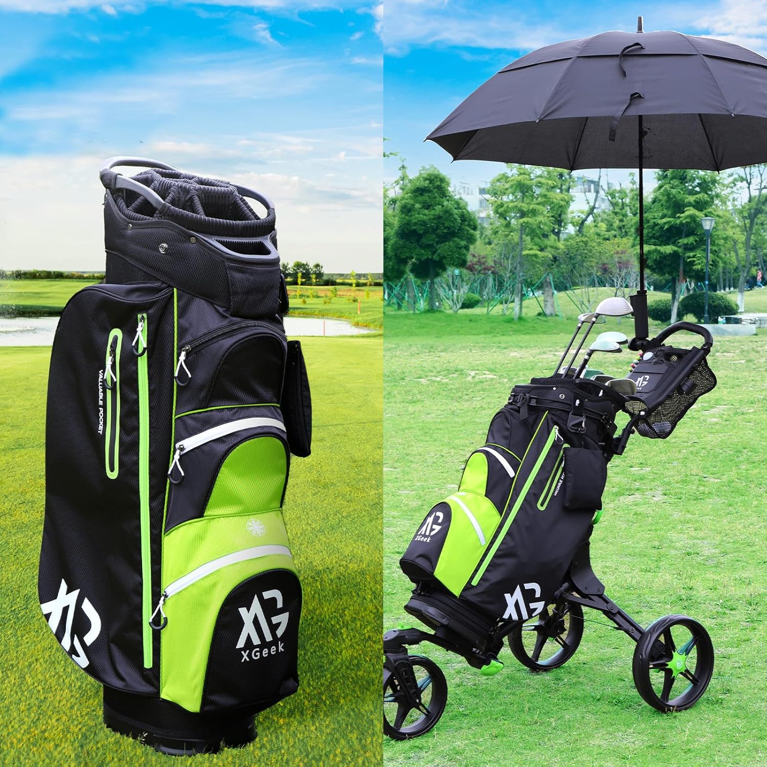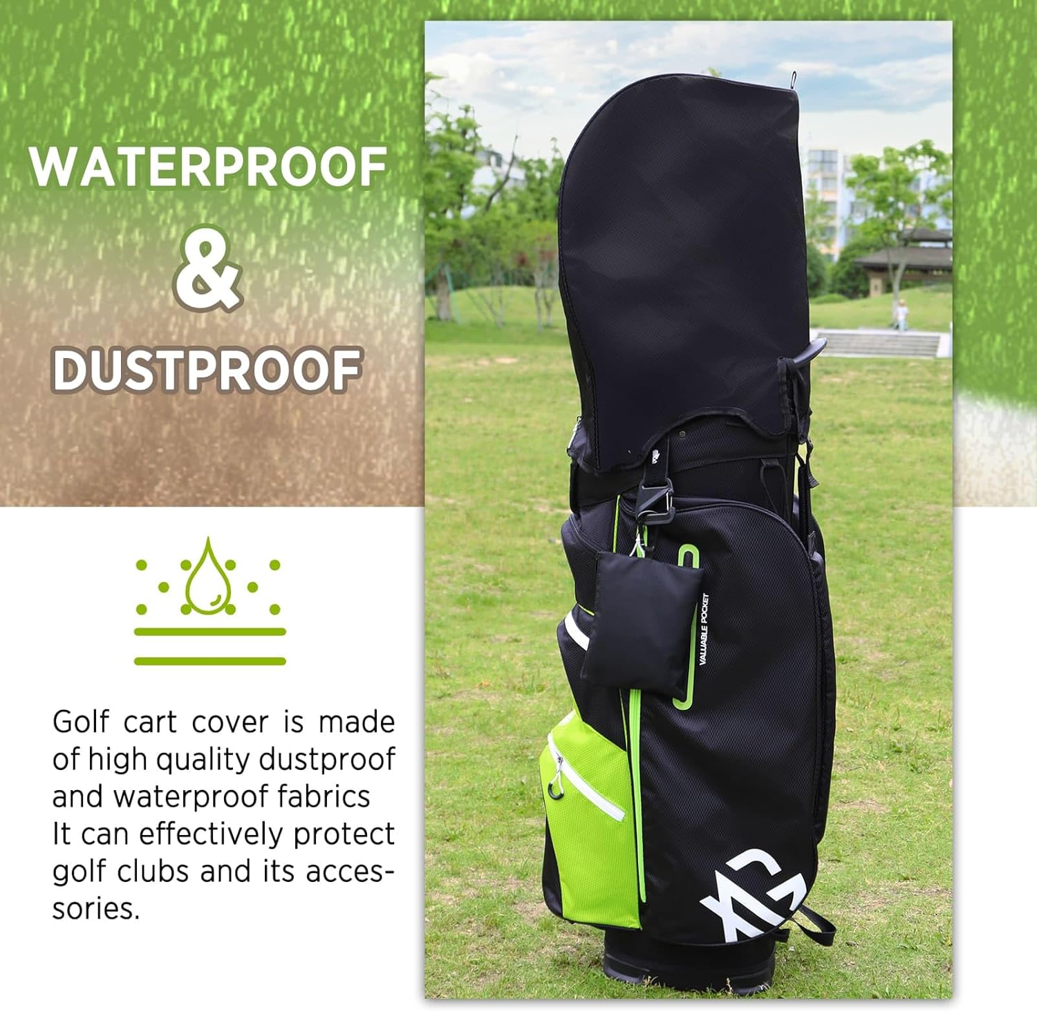 - Diseño ergonómico con asas dobles y bolsillos laterales con fundas para palos, facilita su transporte en carrito y protege tus equipos de golf.