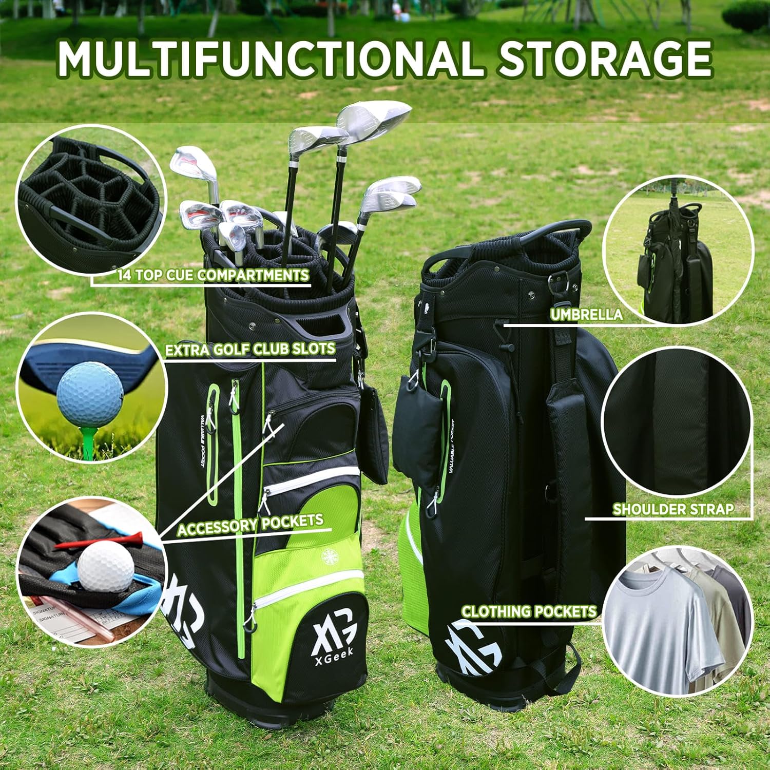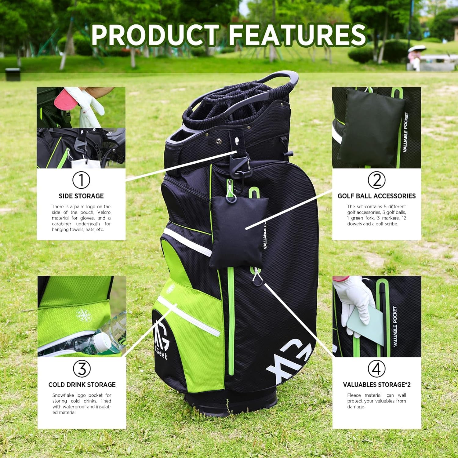 - Bolsillos multifuncionales para almacenamiento en la bolsa de golf, con compartimentos para objetos de valor y sección para bebidas frías.